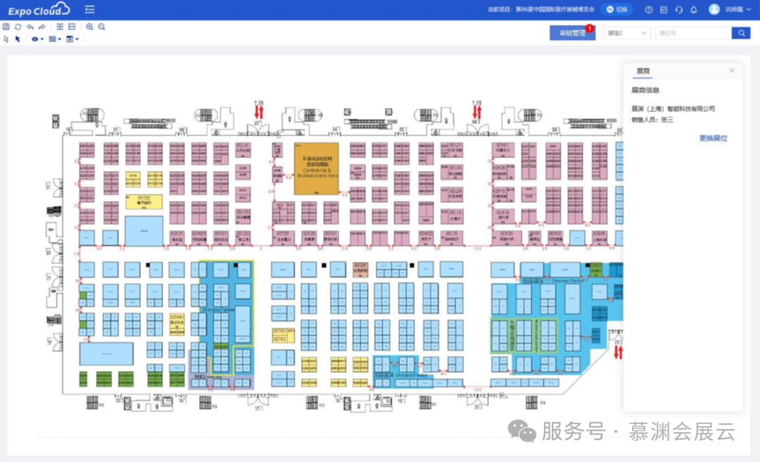 慕渊云助力米奥兰特,全新升级展位销售工具,展会内部管理的展位图可以直接发布到工作平台,各角色可以直接在动态展位图中查看、规划、预订展位。